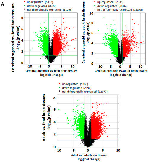 Microarray and IPA analyses were performed in a similar manner to previous publications [7,19]. The microarray assay (Arraystar Human LncRNA Microarray V4.0) and data analysis services were provided by Arraystar Inc. (Rockville, MD) to assess and compare the gene expression of 20,723 mRNAs across iPSC-derived cerebral organoids following 2-month differentiation (designated as cerebral organoids 1, 2, and 3), fetal brain tissue, and adult brain tissue. Fetal brain tissue (n = 3) was obtained from Cell Applications (1F01-50; two separate lots from different human fetal brains aged 21 weeks: designated as fetal 1 and 2) and Takarabio (636526; pooled from 59 fetal/20–33 weeks: designated as Fetal 3). Adult human brain tissue (n = 3) was obtained from Biochain (R1234035-50; from a 29-year old donor: designated as Adult 1) and Takarabio (636530; two separate lots pooled from four donors/21–29 years old and five donors/21–66 years, respectively: designated as adults 2 and 3). Before performing the microarray assay, the RNA samples underwent quality control analysis for RNA integrity, quantity, purity, and genomic DNA contamination. The RNA was reverse transcribed to cDNA, from which the Cy-3 labeled cRNA was synthesized. The cRNA was hybridized to microarray probes for fluorescence intensity scanning. The p-values were calculated using an unpaired t-test. The fold change was calculated by comparing the normalized intensities between two conditions. Differentially expressed mRNAs were designated by expressing above ± 2.0 fold change and p < 0.05 between cerebral organoid, fetal, and adult brain samples, and were shown in volcano plots. Volcano plots are useful tools for visualizing differential expression between two different conditions. They are constructed using fold change values and p-values, and thus allow us to visualize the relationship between fold change (magnitude of change) and statistical significance. The volcano plot is constructed by plotting the negative log10 of the p value on the y axis. The x axis is the log2 of the fold change between the two conditions. The red data points denote significantly upregulated expression and the green points denote downregulated genes.