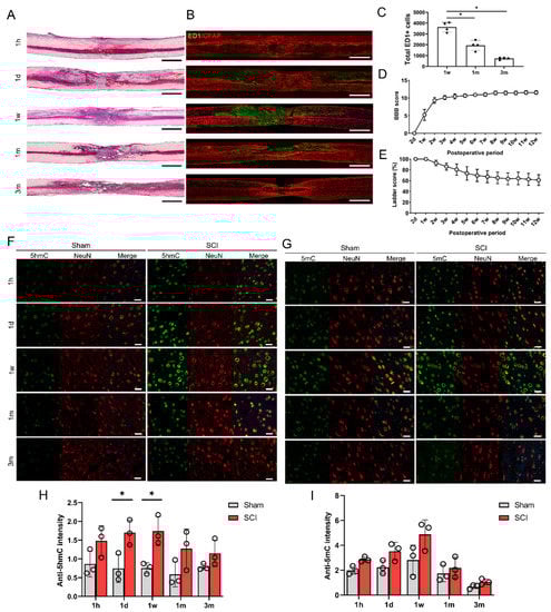 Histological and functional changes following spinal cord contusion injury in rats. (A) Representative images of hematoxylin and eosin staining of contused spinal cords at 5 time points (1 h (1 h), 1 day (1 d), 1 week (1 w), 1 month (1 m), and 3 months (3 m)). Black and white scale bars = 1000 µm. (B) Representative immunohistochemical images of ED1 (green) and GFAP (red) in contused spinal cords at 5 time points. (C) The total numbers of ED1-positive cells within sagittal sections from immunohistochemical images of contused spinal cords at 1 week (1 w), 1 month (1 m), and 3 months (3 m) (n = 4 at each time point); * p < 0.05 between groups by one-way analysis of variance (ANOVA) and Games–Howell post hoc tests. (D,E) Basso-Beattie-Bresnahan (BBB) scores (D) and ladder scores (E) of spinal cord injury (SCI) models from 2 days (2 d) to 12 weeks (12 w) after injury (n = 7). (F,G) Representative immunohistochemical images of double staining of 5hmC (green) and NeuN (red) (F), and of 5mC (green) and NeuN (red) (G) in the primary motor cortexes of sham control rats and SCI model rats at 5 time points (G). Staining of 5mC (H) within the primary motor cortexes of sham and SCI rats at 5 time points (n = 3 at each time point). White scale bars = 20 µm. (H,I) The 5hmC (H) and 5mC (I) intensity in neurons in the primary motor cortexes of sham control (n = 3) and SCI model rats (n = 3) at 5 time points; * p < 0.05 between the sham control and SCI group by the Mann-Whitney U test.