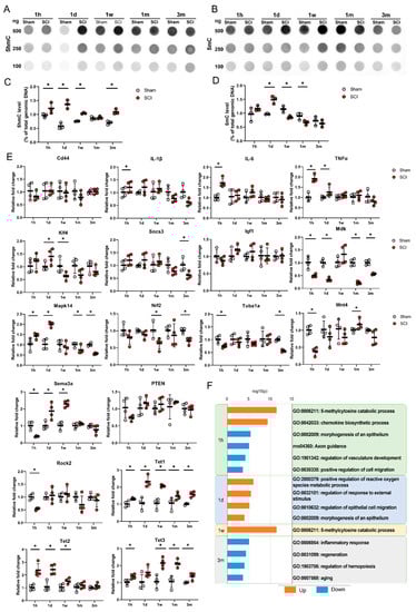 (A,B) Dot blot and real-time PCR results for the primary motor cortexes of sham control and spinal cord injury (SCI) models at 5 time points. Representative results for 100, 250, and 500 ng of DNA for 5hmC (A) and 5mC (B) in sham control and SCI model rats at 1 h (1 h), 1 day (1 d), 1 week (1 w), 1 month (1 m), and 3 months (3 m). (C,D) Quantitative data from dot blot analysis of 250 ng of DNA for 5hmC (C) and 5mC (D) compared with the amount in total genomic DNA (%) in the sham and SCI groups (n = 3 per group); * p < 0.05 between the sham control and SCI groups by Mann–Whitney U test at the same time point. (E) Quantitative data from real-time PCR for inflammation-related genes (Cd44, IL-1β, IL-6, and TNFα), regeneration-related genes (Klf4, Socs3, Igf1, Mdk, Mapk14, Nrf2, Tuba1a, and Wnt4), degeneration-related genes (Sema3a, PTEN, and Rock2), and TET family genes (Tet1, Tet2, at Tet3) at 5 time points (n = 4 per group); * p < 0.05 between the sham control and SCI groups by Mann-Whitney U test at the same time point. (F) Gene Ontology (GO) functional enrichment analysis was performed for the differentially expressed genes between the sham and SCI groups at 5 time points using Metascape. The values are expressed as the negative log10-transformed p-values. Blue bars = upregulated genes, orange color bars = downregulated genes.