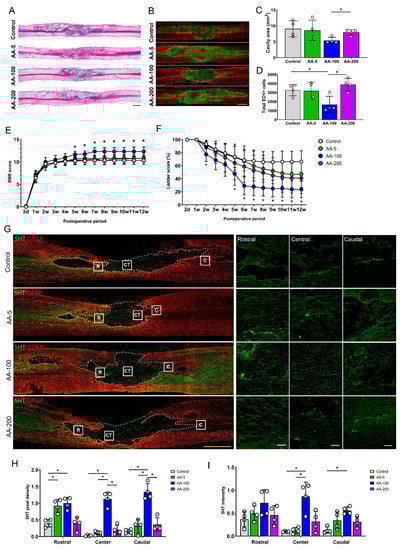 Three different concentrations of AA (5, 100, and 200 mg/kg/day) were administered intraperitoneally to SCI models, and the models were observed for 12 weeks after treatment. H&E staining at 1 week revealed that the area of the cavity was smaller in the 100 mg/kg AA-treated SCI group (AA-100 group) than in the AA-200 group, but the area in the AA-100 group was not smaller than that in the control group (Figure 3A). There were fewer ED1-positive macrophages or microglia in the AA-100 group than in the control and AA-200 groups (Figure 3C). With regard to locomotor function during the 12 weeks after SCI, the AA-100 group started to show a significantly higher BBB score than the control group at 5 weeks (11.67 ± 0.71 vs. 10.22 ± 0.83; AA-100 group vs. control group), and the difference persisted until 12 weeks (12.33 ± 1.0 vs. 10.33 ± 0.87, respectively) (Figure 3E). The ladder test revealed a greater restoration of hind limb function in the AA-100 group than in the control group at 2 weeks (77.45 ± 11.03% vs. 93.20 ± 5.28%; AA-100 group vs. control group), and at all time points from 5 weeks (47.54 ± 17.83% vs. 73.54 ± 16.9%49%, respectively) until sacrifice at 12 weeks (23.50 ± 12.79 vs. 66.20 ± 16.66, respectively). After sacrifice, we performed IHC using a 5HT antibody to detect axonal sprouting within the lesion cavities of the control and AA-treated SCI model rats (Figure 3G). When the cavity was divided into three parts (rostral, central, and caudal parts), the 5HT pixel densities at the central and caudal parts were greater in the AA-100 group than in the control and other AA groups (the AA-5 and AA-200 groups) (Figure 3H). In addition, the 5TH intensity was higher in the AA-100 group than in the control group, whereas the 5HT intensity in the other AA groups was not different from that in the control group (Figure 3I). The intensity of NF200-positive neurofilaments within a lesion cavity was also higher in AA-100 group than in the control and other AA groups (Figure S2A,B).