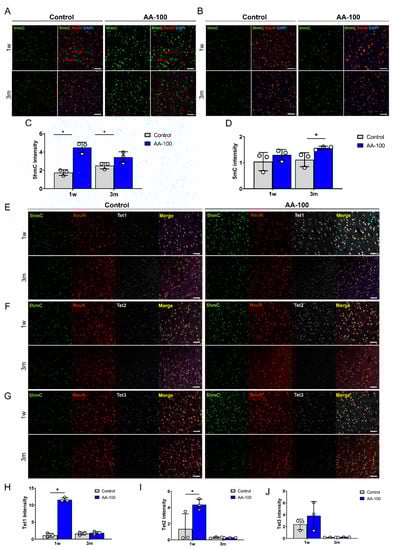 (A,B) Representative immunohistochemical images showing double staining of 5hmC (green) and NeuN (red) (A), and of 5mC (green) and NeuN (red) (B) in the primary motor cortexes of rats in the control and AA-100 groups 1 week (1 w) and 3 months (3 m) after injury. White scale bars = 50 µm. (C,D) The 5hmC (C) and 5mC (D) intensity in neurons in the primary motor cortexes of rats in the control (n = 3) and AA-100 (n = 3) groups 1 w and 3 m after injury; * p < 0.05 between the control and AA-100 groups at the same time point by Mann-Whitney U test. (E–G) Representative immunohistochemical images showing triple staining of Tet1 (gray), 5hmC (green), and NeuN (red) (E); Tet2 (gray), 5mC (green), and NeuN (red) (F); and Tet3 (gray), 5mC (green), and NeuN (red) (G) in the primary motor cortexes of rats in the control and AA-100 groups 1 w and 3 m after injury. White scale bars = 50 µm. (H–J) Tet1 (H), Tet2 (I), and Tet3 (J) intensity of 5hmC-stained neurons in the primary motor cortexes of rats in the control (n = 3) and AA-100 (n = 3) groups 1 w and 3 m after injury; * p < 0.05 between the control and AA-100 groups at the same time point by Mann-Whitney U test.