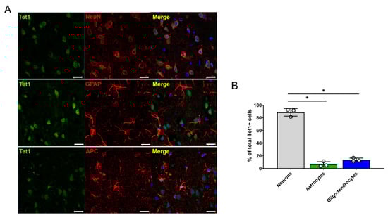Distribution of Tet1 genes within neurons, astrocytes, and oligodendrocytes in the brain motor cortex 1 week after injury. (A) Representative immunohistochemical images of double staining of Tet1 (green) and NeuN (red), of Tet1 (green) and GFAP (astrocytes), and of Tet1 (green) and APC (red). White scale bars = 20 µm. (B) Percentages of NeuN-positive neurons, GFAP-positive astrocytes, and APC-positive oligodendrocytes among total Tet1-positive cells (n = 3 per cell type); * p < 0.05 between groups by one-way analysis of variance (ANOVA) and Games-Howell post hoc tests.