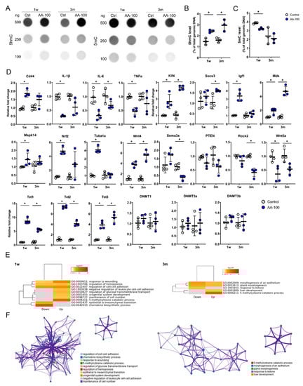 Dot blot and real-time PCR results for the primary motor cortexes of rats in the control and AA-100 groups at 1 week (1 w) and 3 months (3 m) after injury. (A) Representative results for 100, 250, and 500 ng of 5hmC and 5mC in the control and AA-100 groups 1 w and 3 m after injury. (B,C) Quantitative data from dot blot analysis of 250 ng of 5hmC (B) and 5mC (C) levels compared with the amount in total genomic DNA (%) in the control and AA-100 groups (n = 3 per group); * p < 0.05 between the control and AA-100 groups by Mann-Whitney U test at the same time point. (D) Quantitative data from real-time PCR for inflammation-related genes (Cd44, IL-1β, IL-6, and TNFα), regeneration-related genes (Klf4, Socs3, Igf1, Mdk, Mapk14, Nrf2, Tuba1a, and Wnt4), degeneration-related genes (Sema3a, PTEN, Rock2, and Wnt5a), TET family genes (Tet1, Tet2, and Tet3), and DNA methyltransferase genes (DNMT1, DNMT3a, and DNMT3b) at 1 w and 3 m after injury; * p < 0.05 between the control and AA-100 groups by Mann-Whitney U test at the same time point (n = 4 per group). (E) Gene Ontology (GO) functional enrichment analysis was performed for the differentially expressed genes between the control group and the AA-100 group at 1 w and 3 m after injury using Metascape. The values are colored by the negative log10-transformed p-values. Down = downregulated genes; Up = upregulated genes. (F) Network of the enriched GO terms for the upregulated genes at 1 w and 3 m after injury. The nodes are colored by cluster ID and the network was created using Metascape.