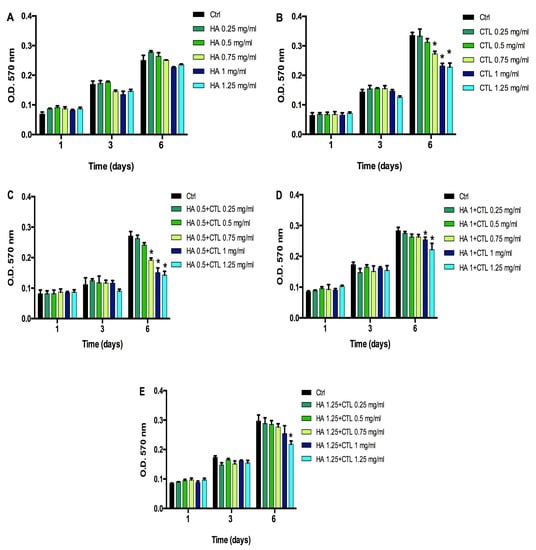 Time-dependent effects of HA and CTL, alone or in combination on human chondrocyte viability. 7000/cm2 cells were seeded in 24-well culture dishes and treated at the indicated concentrations of (A) HA, (B) CTL or different combination of HA-CTL mixture (C–E). for different exposure times. The MTT test was performed 1, 3 and 6 days after treatment. Data are reported as mean ± SE of three independent experiments. Statistical differences based on unpaired Student’s t-test. * p ≤ 0.05 vs. untreated cells.