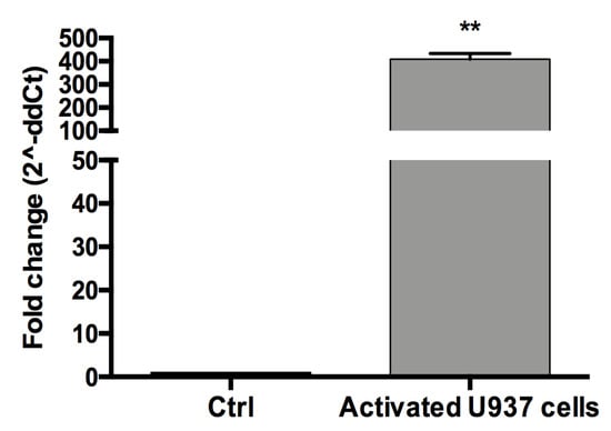 Detection of CD68 in activated U937 human monocytes. Cells were subsequently treated with PMA for 48 h and LPS for 1 h and then mRNA expression of the macrophage differentiation marker CD68 was evaluated by qPCR analysis after 24h. Data are expressed as mean ± SE of three independent experiments. Statistical differences based on unpaired Student’s t-test. ** p < 0.01 vs. untreated cells.