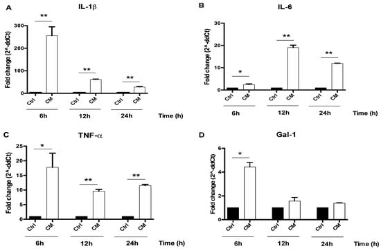 The conditioned medium (CM) of activated U937 cells induced pro-inflammatory molecules expression. Human chondrocytes were exposed for 24h to CM of activated U937 and then cultured under optimal conditions. RNA transcript levels specific for (A), IL-1β, (B) TNF-α, (C) IL-6 and (D) Gal-1 were evaluated by qPCR as described in the Materials and Methods section. Statistical differences based on unpaired Student’s t-test. Data are expressed as mean ± SE obtained from at least three independent experiments. CM, chondrocytes cultures exposed to U937 CM. * p < 0.05 and ** p < 0.01 vs. untreated cells.