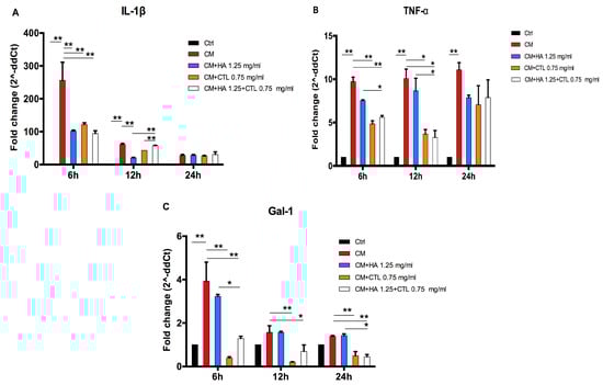 The anti-inflammatory effect of the HA and CTL was tested on chondrocyte cultures treated with the CM of activated U937 human monocytes for 24h. Cell cultures were subsequently treated with the HA, CTL or their mixture, at different concentrations. The results showed that the molecules and their mixture induced a significant down-regulation of IL-1β (p < 0.01) and TNF-α (p < 0.05) gene expression at 6 h after treatment and that this effect was still evident at 12 h of culture (Figure 4A,B). At this time point IL-1β expression in the presence of HA-CTL mixture was significantly reduced in comparison with that exerted by single compounds (p < 0.05). Moreover, the same mixture leads also to a significant down-regulation of TNF-α expression at 6 and 12h post-treatment, when compared to that induced by HA alone (p < 0.05). CTL and HA-CTL mixture, but not HA, significantly decreased the levels of Gal-1 expression (Figure 4C) at 6, 12 and 24 h after treatment (p < 0.01).