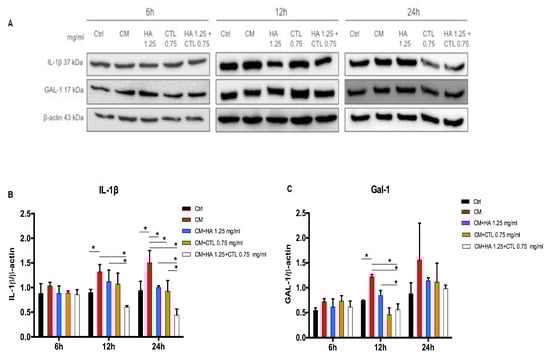 The western blotting analysis (Figure 5 and Figure S2) confirmed that the CM of activated U937 human monocytes caused an increased expression of IL-1β, and Gal-1. The addition of HA and CTL to inflamed cell cultures induced a down-regulation of IL-1β expression only at 24 h (p < 0.05), whereas their mixture at 12 and 24 h (p < 0.05, Figure 5B). Furthermore, HA-CTL significantly reduced the expression of IL-1β in comparison with that induced by the single compounds at 12 and 24 h after treatment (p < 0.05, Figure 5B). CTL and HA-CTL reduced Gal-1 levels at 12 h after treatment (p < 0.05, Figure 5C).