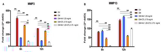 MMP-3 and MMP-13 expression of chondrocytes cultures exposed to U937 CM in the presence or absence of HA, CTL and their mixture. Human chondrocytes were exposed for 24h to CM of activated U937 and then cultured in the presence or absence of 1.25 mg/mL HA, 0.75 mg/mL CTL or their mixture. RNA transcript levels specific for (A) MMP-3 and (B) MMP-13 were evaluated by qPCR as described in the Materials and Methods section at 6 and 12h after treatment. Statistical differences are based on one-way ANOVA test with multiple comparisons. Data are expressed as mean ± SE obtained from three independent experiments. CM, chondrocytes cultures exposed to U937 CM. * p < 0.05 and ** p < 0.01 vs. untreated cells or compared with respective CM treated cells.