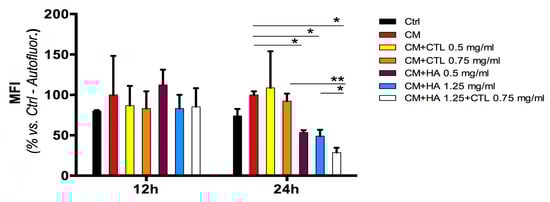 Reactive oxygen species (ROS) generated in human chondrocytes by U937 CM treatment generated in the presence or absence of HA, CTL alone or in combination. Primary cultures of human chondrocytes were exposed to U937 CM for 24 h and then treated for 12 or 24 h with 1.25 mg/mL HA, or 0.75 mg/mL CTL or their mixture. Cells were cultured under optimal conditions and then evaluated at different times for intracellular ROS production using the FACS-activated 2′,7′-dichlorofluorescein diacetate probe, collecting at least 10,000 events. ROS formation is expressed as percentage of U937 CM treated chondrocyte fluorescent intensity. Statistical differences are based on one-way ANOVA test with multiple comparisons (Fisher LSD). Data are reported as mean ± SE of the percentage of fluorescence observed in at least two independent experiments. * p < 0.05 compared with respective CM treated control.