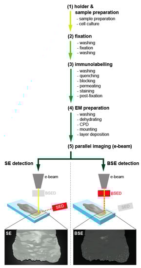 Overview of experimental design. The graphical summary depicts the five main components of the experimental setup. After holder and sample preparation (1), which is individually designed according to the requirements of the electron microscope, the biological sample has to be prepared. Pre-fixation ensures structure and protein stability (2), and the labelling procedure, which needs to be optimized with respect to the sample, the protein of interest, and the respective antibody, endures the protein localisation (3). Before the sample can be imaged, it has to be finalised for EM preparation (4). Finally, the probe can be imaged on the same microscope, simultaneously collecting the secondary electrons (SE, left) for ultrastructural information and the back-scattered electrons (BSE, right) for the visualisation and localisation of the gold-conjugated antibodies (5).