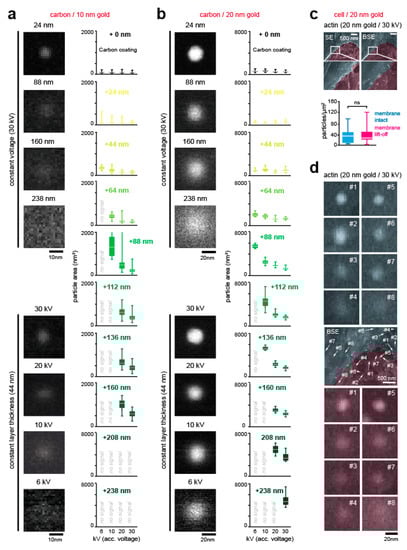Validation of gold particle detection accuracy. (a,b) Detection of 10 nm (a) and 20 nm (b) gold particles through carbon layer via BSE detector. To the left, images of gold particles acquired at 50,000× magnification (1.45 nm per pixel), with an acceleration voltage of 30 kV. Samples were imaged with constant acceleration voltage and varying layer thickness (top) as well as with varying acceleration thickness and constant layer thickness (bottom). To the right, analysis of the scattering area. From top to bottom, gold particles were deposited on an EM grid (0 nm) and coated with increasingly thick carbon layers. For each thickness, acceleration voltages of 6 kV, 10 kV, 20 kV, and 30 kV were applied. Boxplots depict the scattering area of back-scattered electrons. (c) Partially unroofed cell samples. Samples were prepared and labelled with a primary antibody directed against actin, as mentioned above. In some regions, weakly adhesive tape was used to partially unroof the cell (pink, membrane lift-off), and imaged in SE (top) and BSE (bottom) mode. Images of 20 nm gold particles were acquired at 25,000× magnification (2.89 nm per pixel), with an acceleration voltage of 30 kV. For statistical analysis, gold particles were counted in intact membrane areas (cyan) and compared to unroofed areas (pink) (intact membrane, n = 20 images; lift-off membrane, n = 11 images; t-test with Welch’s correction p < 0.5969; Mann-Whitney test p = 0.6349). (d) BSE of gold-labelled endogenous actin in cellular sample shows spherical blurring. Antibodies directed against actin were labelled with 20 nm gold particles and acquired at 25,000× magnification (2.89 nm per pixel), with an acceleration voltage of 30 kV. Note the “halo” in regions with intact membranes (top, cyan) and where membrane was removed (bottom, pink). Scale bar: (a) 10 nm, (b) 20nm, (c) 500 nm, and (d) 500 nm and 20 nm.