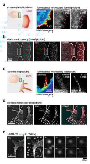 To further probe the validity of the method, we took advantage of filopodia, a sensory and migratory structure present in several cell types. The size of these subcellular structures is well within the detection range of SE/BSE microscopy and should host accumulated amounts of I-BAR proteins. Indeed, ratiometric and super-resolution images showed an enrichment of transfected I-BAR domain over a cytosol reference in filopodia (Figure 3c). Consistently, SE/BSE showed I-BAR enrichment in filopodial structures (Figure 3d).