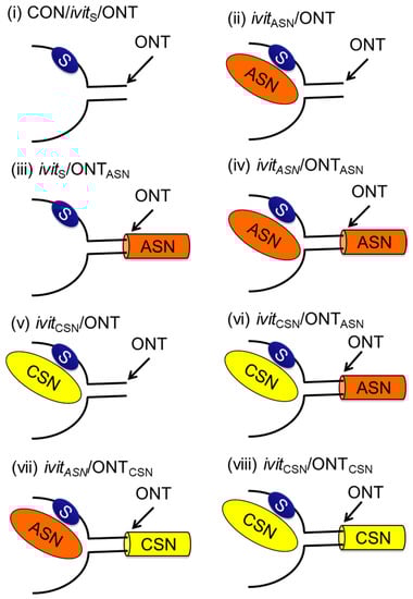 All animals were randomly assigned to experimental groups with the experimenter masked to the treatment conditions. The optic nerve of adult male Fischer rats was crushed bilaterally [20,34,35,40,41,42,43] and CSN and ASN implanted ivit and/or anastomosed to the cut end of the transected optic nerve to study their effects on RGC survival and axon regeneration. Unless otherwise stated, experimental groups comprised 8 rats in each group (i.e., 16 optic nerves and 16 retinae/group): (i), after Sterispon (S) plugging of a scleral incision through the retina into the vitreous body—sham ivit implantation group (Control (CON)/ivitS/ONT); (ii) an ASN was implanted ivit immediately after ONT—ivitASN/ONT group; (iii) after sham ivit implantation, an ASN was anastomosed to the proximal ONT site—ivitS/ONTASN group; (iv), an ASN was implanted ivit immediately after ONT and an ASN was anastomosed to the proximal ONT site—ivitASN/ONTASN group; (v), a CSN was grafted ivit immediately after ONT—ivitCSN/ONT group; (vi), a CSN was implanted ivit after ONT and an ASN graft anastomosed to the proximal ONT stump—ivitCSN/ONTASN group; (vii), an ASN was implanted ivit and a CSN graft immediately anastomosed to the proximal ONT stump—ivitASN/ONTASN group; (viii), a CSN was implanted ivit and also immediately anastomosed to the proximal ONT stump—ivitCSN/ONTCSN group. Uninjured rats were used to control for baseline parameters where indicated—intact groups (Figure 1). Optic nerves and retinae were processed for immunohistochemistry and western blot at 21 days after surgery, as described below.