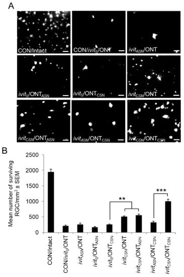 Fluorogold (FG)+ retinal ganglion cells (RGC) at 21 days after grafting in retinal wholemounts from: (A) CON/intact, CON/ivitS/ONT, ivitASN/ONT, ivitS/ONTASN, ivitS/ONTCSN, ivitCSN/ONT, ivitCSN/ONTASN, ivitASN/ONTCSN, and ivitCSN/ONTCSN groups. Note that the ivitCSN/ONTCSN group show the greatest RGC neuroprotection (scale bars = 20 μm). (B) Quantification of numbers of FG+ RGC in retinal wholemounts confirms that RGC survival is increased in all ivitCSN paradigms with the greatest survival observed in the ivitCSN/ONTCSN group. n = 16 retinae/group; ** p < 0.001; *** p < 0.0001, ANOVA.