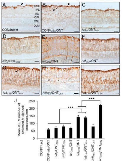 Müller cell/astrocyte activation in the retina at 21 days after grafting. Representative images of glial fibrillary acidic protein (GFAP)+ astrocytes (arrowheads) and activated Müller cell processes (arrows) in: (A) CON/intact, (B) CON/ivitS/ONT, (C) ivitASN/ONT, (D) ivitS/ONTASN, (E) ivitS/ONTCSN, (F) ivitCSN/ONT, (G) ivitCSN/ONTASN, (H) ivitASN/ONTCSN, and (I) ivitCSN/ONTCSN groups. Note the increased glial activation after ivitCSN grafting (scale bars = 50 μm). (J) Quantification of the number of Müller cell processes confirms that ivitCSN promotes glial activation in the retina. n = 16 retinae/group; *** p < 0.0001, ANOVA.