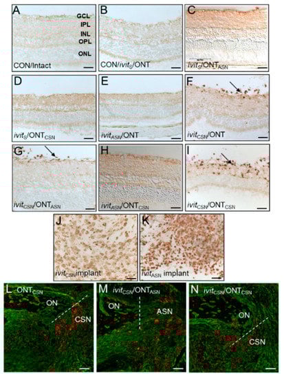 Macrophages accumulate in the retina in eyes containing ivitCSN implants at 21 days after grafting. ED1-HRP+ macrophages in the vitreous body and retina in: (A) CON/intact, (B) CON/ivitS/ONT, (C) ivitASN/ONT, (D) ivitS/ONTASN, (E) ivitS/ONTCSN, (F) ivitCSN/ONT, (G) ivitCSN/ONTASN, (H) ivitASN/ONTCSN, and (I) ivitCSN/ONTCSN groups. ED1+ macrophages were present in both (J) ivitCSN, and (K) ivitASN implants; ED1+ macrophages (red) at the anastomosis site of (L) ONTCSN; (M) ivitCSN/ONTASN; (N) ivitCSN/ONTCSN groups (scale bars in A–K = 50 μm; in L–N = 100 μm). n = 16 retinae/group.
