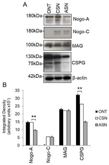 Nogo-A, MAG, and CSPG were detected by western blot in ON lysates and lysates from CSN and ASN grafts whilst Nogo-C was restricted to CSN and ASN grafts (Figure 5A,B). In addition, significantly lower levels of both Nogo-A and CSPG (p < 0.01) were observed in ASN grafts compared to CSN grafts (Figure 5A,B) suggesting that the freeze–thawing process may have removed some of these molecules. The levels of MAG and Nogo-C were unaffected by freeze–thawing.