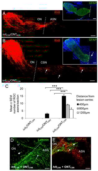 Regeneration of rhodamine B (RhB)+ RGC axons (red) into cellular sciatic nerve (CSN) or acellular sciatic nerve (ASN) grafts at 21 days after optic nerve transection (ONT). Representative images of longitudinal sections of optic nerve and graft in (A), ivitCSN/ONTASN and (B), ivitCSN/ONTCSN groups—note the presence throughout the length of the ONTCSN graft of RhB+ (red) regenerating RGC axons (open arrows) and their limited penetration into the ONTASN graft (A,B insets), optic nerve GFAP+ astrocyte processes (green) do not enter ONTASN grafts, but do enter the proximal region of the ONTCSN graft (closed arrow) (scale bars in A, B, and D = 200 µm; broken line indicates anastomosis site). (C) Quantification of the number of axons extending 400, 800, and 1200 μm past the anastomosis site into the ONTCSN graft (*** p < 0.0001). A few axons penetrate the junctional zone of ONTASN grafts compared to the numbers extending for long distances into ONTCSN grafts. (D), anastomosis site in an ivitCSN/ONTCSN rat showing the laminin+ basal lamina of the optic nerve vasculature (arrow heads) and Schwann cell basal lamina tubes aligned in parallel arrays in the ONTCSN graft (arrow), with which (E) regenerating RGC axons are associated with the extent of GFAP+ astrocyte process (green) invasion and the growth of RhB+ RGC axons (red) (scale bars = 150 µm; the broken line indicates the anastomosis site).