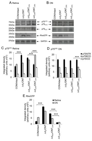 (1) Regulated intramembranous proteolysis (RIP) of p75NTR: (i) in the retina: Levels of full-length p75NTR (75kDa) and the extracellular domains (ECD), p75ECD (≈55kDa), were up-regulated in ivitS/ONT, and ivitASN/ONTCSN compared to CON/intact lysates, but levels of the intracellular domain (ICD), p57ICD (≈25kDa), were unchanged (Figure 7A,B) and, in the ivitCSN/ONTCSN group, full-length p75NTR was unchanged but both p75ECD and p75ICD were significantly elevated (p < 0.01 and p < 0.0001, respectively) compared to levels in the ivitASN/ONTCSN group (Figure 7A,B). (ii) In the optic nerve: Levels of full length and fragmented p75NTR were similar in the ON of all groups, except in the ivitCSN/ONTCSN group in which p75ICD had increased significantly (p < 0.0001; Figure 7C,D).