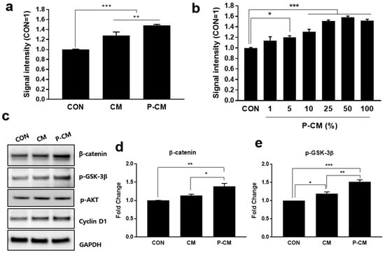 Primed CM (P-CM) induced the viability of DPCs and increased the expression of β-catenin and p-GSK-3β [SER9]. DPCs were treated with 25% CM and P-CM in DMEM for 48 h. DPCs were cultured in DMEM medium without supplementation as a control. (a) The cell viability of the DPCs, which was evaluated by the CCK-8 assay, was significantly increased after treatment with 5% P-CM. (b) The data shows that the viability of DPCs increased with an increasing P-CM concentration. (c–e) Western blot analysis: After treating DPCs with 25% CM or P-CM for 48 h, cell lysates were collected and subjected to western blot analysis with specific antibodies. β-catenin and p-GSK-3β [SER9] expression in P-CM-treated DPCs was significantly increased. In addition, there was also an increase in p-AKT and cyclin D1 in P-CM-treated cells. The data are reported as the fold change in comparison to the control group (CON). Data represent the mean ± SD. Each experiment was repeated at least three times. Statistically significant differences were determined by one-way nonparametric ANOVA. * p < 0.05, ** p < 0.01, and *** p < 0.001. Abbreviations: CON, raw Dulbecco’s modified Eagle’s medium (DMEM); CM, mesenchymal stromal cell (MSC)-derived conditioned medium; P-CM, primed MSC-derived conditioned medium; DPCs, follicle dermal papilla cells.