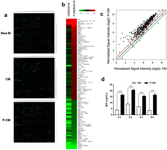 Priming MSCs with TGF-β1 and LiCl resulted in a significantly increased secretion of MIF. (a,b) CM and P-CM, collected from supernatants of MSCs after priming with or without TGF-β1 and LiCl, were subjected to an antibody array, and the dot intensity was then analyzed. The normalized log2 expression of cytokines, chemokines, and proteins in P-CM showed significant differences (p < 0.05) between the CM and P-CM groups, which is represented by the color scale. MIF levels in MSCs with priming were significantly increased. (c) After being normalized to Raw M, the normalized intensities of CM and P-CM were the logarithm to base 2 for comparison. Detailed increases (1.5-fold, red line) and decreases (1.5-fold, green line) of P-CM compared to CM are shown. (d) The secretion of MIF was measured by ELISA in four lots of UCB-MSCs after priming with TGF-β1 and LiCl. Data represent the mean ± SD. ELISA was repeated four times in triplicate. The growth factor array was repeated two times. Statistically significant differences were determined by one-way nonparametric ANOVA. *** p < 0.001. Abbreviations: MSC, mesenchymal stromal cells; MIF, macrophage migration inhibitory factor; CM, MSC-derived conditioned medium; P-CM, primed MSC-derived conditioned medium; Raw M, raw medium; UCB, umbilical cord blood.