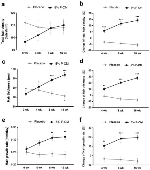 Clinical study of hair growth in participants using P-CM at 4, 8, and 16 weeks. The results of the clinical study suggest that a hair tonic containing 5% P-CM could help to treat androgenetic alopecia. Measurements of the (a,b) hair density, (c,d) hair thickness, and (e,f) hair growth rate showed a significant increase in the 5% P-CM-treated group compared to the placebo group. Statistically significant differences for the (a) total hair density, (c) hair thickness, and (e) hair growth rate were determined between week 0 and 16 of the same group. For the change of the (b) hair density, (d) hair thickness, and (f) hair growth factor, a significant difference of P-CM was determined compared to the placebo group. * p < 0.05, ** p < 0.01, and *** p < 0.001. Abbreviations: P-CM, primed MSC-derived conditioned medium.