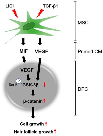 MSCs are living cells that can adapt to disease environments by changing their pattern of trophic factor secretion. MSC-derived CM is a promising pharmaceutical agent for regenerative medicine, including treatment for hair loss. CM is a collection of trophic factors free from MSCs; thus, it should be possible to tailor this CM by pretreating MSCs in order to induce the secretion of specific factors optimized for the promotion of hair growth [21,22,23]. For pretreatment, we first exposed MSCs in vitro to an artificial environment mimicking an alopecia state in hair follicles (“priming”). Human hair follicles affected by androgenic alopecia showed dramatic decreases in viability and proliferation. Dermal papilla cells (DPCs) on hair follicles manage hair follicle cycling by inducing signaling factors related to cell growth. The restoration of hair induction by DPC stimulation is considered a potential therapy for hair loss. In this study, we demonstrated that conditioned medium (CM), collected from MSCs primed with TGF-β1 and LiCl, upregulated the viability of DPCs and hair growth. MIF, secreted by primed MSCs, induced VEGF in the DPCs by inhibiting GSK-3β, which induces β-catenin phosphorylation (Figure 6).