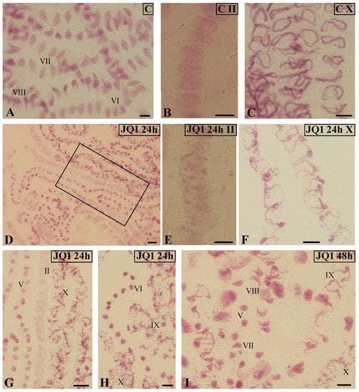 Feulgen-stained spermatid nuclei at antheridial filaments of C. vulgaris spermiogenesis. (A–C) the control material at early (II; B) and late (X; C) stages; (A) synchronous differentiation of spermatids, VI–VIII consecutive spermiogenesis stages; (D–I) material after 24-h (D–H) and 48-h (I) treatment with JQ1; antheridial filaments at different distant developmental stages (II, V, IX, X); (G) magnified area from (D); (E,F) spermatids at early (II; E) and late (X; F) stages; individual images in the frame treatment, time of treatment, and stage of spermiogenesis were given; Scale bars = 5 μm (A–C,E–I), 10 μm (D).
