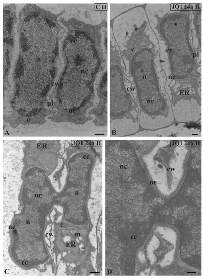 The effect of JQ1 on C. vulgaris spermatids at stage II after 24 h treatment. (A) the control; (B–D) after treatment with JQ1; (C) The fusion of two spermatid nuclei on a longitudinal section; (D) magnification of the fusion site with visible continuity of the nuclear envelope and broken cell wall between spermatids; c, cytoplasm; cc, condensed chromatin; cw, cell wall; ER, endoplasmic reticulum; m, mitochondrion; n, nucleus; nc, non-condensed chromatin; ne, nuclear envelope; on individual images in the frame treatment, time of treatment and stage of spermiogenesis were given; Scale bars = 500 nm (A–C), 200 nm (D).