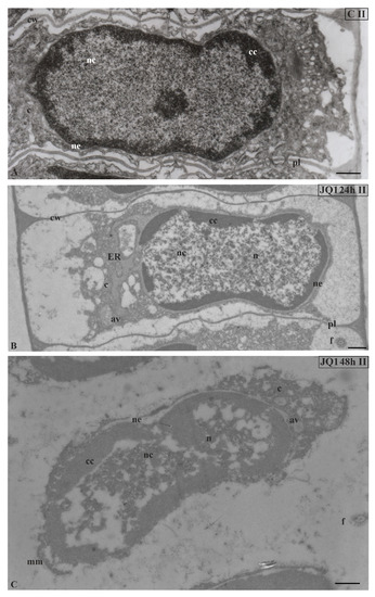 Ultrastructural changes in C. vulgaris spermatids at stage II; (A) the control; (B) after 24-h and (C) 48-h treatment with JQ1; changes in non-condensed chromatin and cytoplasm structure. In spermatids dilated nuclear envelope together with ER cisternae (B) and in nucleus loose spaces (B,C) are visible. Longitudinal section of spermatids; av, autolytic vacuole; c, cytoplasm; cc, condensed chromatin; cw, cell wall; ER, endoplasmic reticulum; f, flagellum; mm, microtubular manchette; n, nucleus; nc, non-condensed chromatin; ne, nuclear envelope; pl, plasmodesmata; on individual images in the frame treatment, time of treatment and stage of spermiogenesis were given; Scale bar = 500 nm.