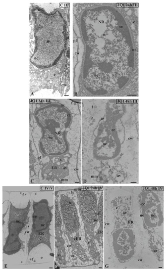 The effect of JQ1 on C. vulgaris spermatids ultrastructure at stage III (A–D) and IV (E–G); (A,E) the control; (B–F) after 24 h (B,C,F) and 48-h (D,G) treatment with JQ1; extended nuclear envelop (B,C) and bright spaces in nucleus in non-condensed chromatin (B–D,G), these spaces cover almost the whole central part of the nucleus (D); (C) reduced cytoplasm with dilated ER cisternae; (D,G) barely visible cell wall between spermatids, strongly reduced cytoplasm, ER cisternae not visible, and a lot of vesicles and lytic vacuoles are present; (E–G) nuclei shifted to one of the side walls, net-like chromatin pattern (F) is not typical of this stage. Longitudinal section of spermatids; av, autolytic vacuole; c, cytoplasm; cc, condensed chromatin; cw, cell wall; ER, endoplasmic reticulum; f, flagellum; mm, microtubular manchette; n, nucleus; nc, non-condensed chromatin; ne, nuclear envelope; NR, nuclear reticulum; pl, plasmodesmata; vER, endoplasmic reticulum vesicle; on individual images in the frame treatment, time of treatment, and stage of spermiogenesis were given; Scale bar = 500 nm.
