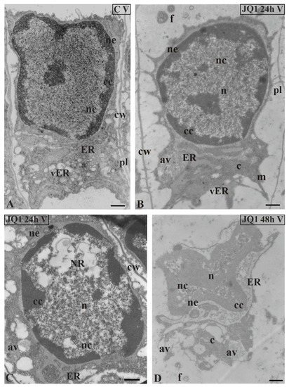 Ultrastructural changes in C. vulgaris spermatids at stage V; (A) the control; (B,C) after 24 h and (D) 48 h treatment with JQ1; (B) Minor changes in non-condensed chromatin, however, strongly dilated ER cisternae and nuclear envelope are visible; (C,D) progressive changes in the nucleus, and the presence of NR and numerous bright spaces; in cytoplasm, the presence of swollen ER cisternae, many vesicles and autolytic vacuoles. Longitudinal section of spermatids; av, autolytic vacuole; c, cytoplasm; cc, condensed chromatin; cw, cell wall; ER, endoplasmic reticulum; f, flagellum; m, mitochondrion; n, nucleus; nc, non-condensed chromatin; ne, nuclear envelope; NR, nuclear reticulum; pl, plasmodesmata; vER, endoplasmic reticulum vesicle; on individual images in the frame treatment, time of treatment and stage of spermiogenesis were given; Scale bar = 500 nm.