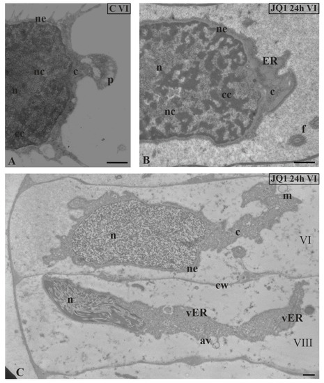 The effect of JQ1 on C. vulgaris spermatids ultrastructure at stage VI; (A) the control, nucleus with net-like chromatin structure; (B,C) after 24-h treatment with JQ1; (B) chromatin structure as in the control, swollen nuclear envelope and ER cisternae; (C) spermatids in the same antheridial filaments at distant developmental stages (VI and VIII); disturbed net-like chromatin structure in nucleus at stage VI and longer loosely arranged chromatin fibrils with spaces between them at stage VIII. Longitudinal section of spermatids; av, autolytic vacuole; c, cytoplasm; cc, condensed chromatin; cw, cell wall; ER, endoplasmic reticulum; f, flagellum; m, mitochondrion; n, nucleus; nc, non-condensed chromatin; ne, nuclear envelope; p, plastid; vER, endoplasmic reticulum vesicle; on individual images in the frame treatment, time of treatment and stage of spermiogenesis were given; Scale bar = 500 nm.