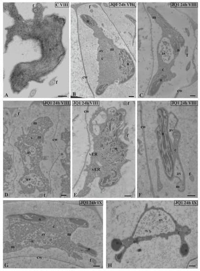 The effect of JQ1 on C. vulgaris spermatid ultrastructure at stages VIII (B–F) and IX (G,H) after 24-h JQ1 treatment; (A) the control, nucleus with long parallel chromatin fibrils; (B,C,E–G) disturbances in chromatin structure, and shorter or longer chromatin fibrils in the form of clusters separated by brighter areas; (C–H) changes in the cytoplasm area, numerous vesicles and large autolytic vacuoles containing fragments of cytoplasm; (H) spermatid with correctly condensed chromatin but with changes in cytoplasm. Longitudinal section of spermatids. Nucleus on cross-section (H); av, autolytic vacuole; c, cytoplasm; cw, cell wall; f, flagellum; m, mitochondrion; n, nucleus; vER, endoplasmic reticulum vesicle; on individual images in the frame treatment, time of treatment and stage of spermiogenesis were given; Scale bar = 500 nm.