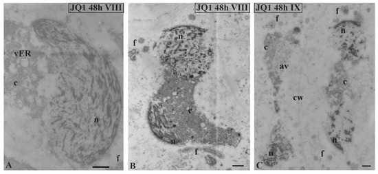 Ultrastructural changes in C. vulgaris spermatids after 48-h JQ1 treatment at stages VIII (A,B) and IX (C); (A–C) short chromatin fibrils with loose arrangement and bright spaces, these disturbances are visible on longitudinal and cross sections of the nucleus; cytoplasm with numerous vesicles and autolytic vacuoles containing fragments of cytoplasm, there is a barely visible cell wall between spermatids. Longitudinal section of spermatids; av, autolytic vacuole; c, cytoplasm; cw, cell wall; f, flagellum; n, nucleus; vER, endoplasmic reticulum vesicle; on individual images in the frame, time of treatment and stage of spermiogenesis were given; Scale bar = 500 nm.