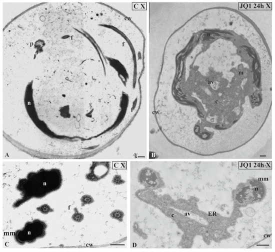 The effect of JQ1 (24 h) on C. vulgaris spermatozoids ultrastructure at stages X; (A,C) the control, very dense chromatin and reduced cytoplasm closely adjacent to the nucleus; (B,D) after treatment with JQ1, disturbances in chromatin structure, long bands chromatin fibrils loosely arranged with light spaces, cytoplasm with vesicles and autolytic vacuoles. Nuclei on longitudinal (A,B) and cross (C,D) section; av, autolytic vacuole; c, cytoplasm; cw, cell wall; ER, endoplasmic reticulum; f, flagellum; m, mitochondrion; mm, microtubular manchette; n, nucleus; p,plastid; on individual images in the frame were placed treatment, time of treatment on individual images in the frame treatment, time of treatment, and stage of spermiogenesis were given; Scale bar = 500 nm.
