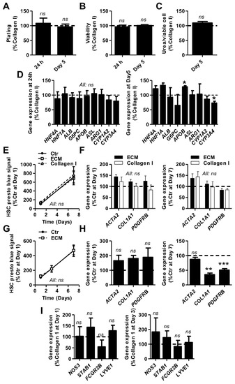 The phenotypic changes that human primary HSCs undergo rapidly upon a culture on hard substrates hampers the study of their physiologic state [37]. Given recent reports showing that ECM components can negatively regulate the activation of rat HSCs and maintain their quiescence-associated phenotype [38,39], we investigated the effects of both coating and culture medium supplementation with solubilized HL-ECM on the activation state of primary human HSCs for up to 7 days of culture on uncoated TCP. We found that neither HL-ECM nor rat tail collagen I coating had influence on HSC parameters as compared to TCP (Figure 3E,F). In contrast, whereas medium supplementation with HL-ECM had no influence on HSC proliferation (Figure 3G) and ACTA2 gene expression, we observed a decrease of COL1A1 and PDGFRB gene expression after 7 days of culture (Figure 3H), indicative of a less activated and fibrogenic cell state.