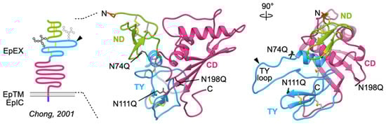 The thyroglobulin-like domain (residues 64–138; TY) is sandwiched between the ND and CD. It is similar by sequence as well as by structure (Figure 2c) to TY domains of other functionally diverse vertebrate proteins: EpCAM paralogue Trop2, p41 invariant chain (TY as inhibitor of cysteine cathepsins), insulin growth factor-like binding proteins (IGBFPs; TY aids in binding IGF), SMOCs, testicans (TY as inhibitors as well as substrates of cysteine cathepsins), nidogens (TY as inhibitors of cysteine cathepsins), and thyroglobulin (some TY domains harbor precursor residues for thyroid hormones). These domains appeared early in the evolutionary history, however they are Metazoa-specific; in vertebrates the TY domain-containing proteins acquired other vertebrate-specific domains by exon shuffling and duplication [27,28]. On the basis of three disulfide bonds and bonding pattern I–II, III–IV, and V–VI, the TY domain of EpCAM is classified as TY type-1A domain (subtype 1B contains two disulfide bonds). Other characteristic features of the domain are a small hydrophobic core composed of N-terminal α-helix and β-sheet, stabilized by the three disulfide bridges, and the CWCV signature sequence motif (Figure 2c). The TY domains of various proteins differ by the length of loops and the N-terminal α-helix, and these structural differences are also linked to their functional diversity. For example, only TY domains with a short α-helix and short loops can act as inhibitors of cysteine cathepsins since longer loops sterically prevent inhibitor-style binding into the enzyme active site cleft [29]. EpCAM TY domain does not inhibit these or other peptidases, it is rather cleaved by them [11]—within TY domain is a dibasic protease sensitive site (G79–R80–R81) located at the protruding loop (Figure 2c). Matriptase, among other proteases, can efficiently cleave EpCAM at this site, thereby destabilizing its interaction with claudin-7 and, consequently, targeting it for internalization and degradation [30]. This protease-sensitive site is the same as the one identified and included in early models of EpCAM (Figure 1). The cleavage at this spot does not result in dissociation of the ND since parts of EpCAM remain tethered together via the C66–C99 disulfide bond within the TY domain (Figure 2c) [11].