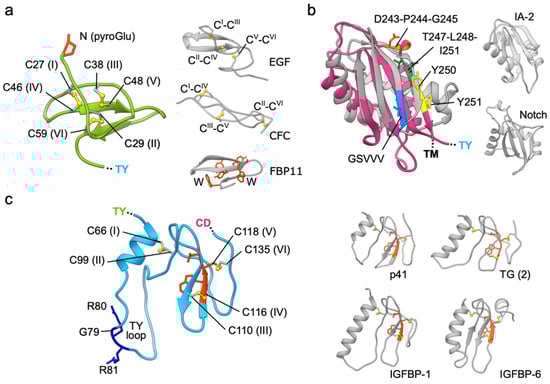 The N-terminal domain (just after the cleaved-off signal peptide, residues 24–63; ND) has a very compact core stabilized by a unique arrangement of three tightly packed disulfide bridges (Figure 2a) [11]. The N-terminal glutamine (Q24) is post-translationally modified to a pyroglutamate [15]. The domain’s orientation is stabilized via several polar as well as hydrophobic contacts with TY and CD. The disulfide bonding pattern is I–IV, II–VI, and III–V (Cys residues sequentially numbered from I to VI) which is clearly different from the canonical I–III, II–IV, and V–VI linkage found in EGF-like domains [17]. Likewise, the spacing between cysteine residues alongside the polypeptide chain differs between EGF-like domains and EpCAM ND. However, the ND does share disulfide linkage with some other small cysteine-rich domains, like the CFC domain of human cripto [18], and is with regard to fold [19] most similar to the disulfide-free WW-type domains [20] found in various proteins like formin-binding protein 3, dystrophin and NEDD, still, all these combined structural aspects are not found in any other protein of known structure, thereby classifying the structure of EpCAM N-terminal domain as unique. Domains of this type, also called cysteine-rich microdomains (size up to 40 aa residues), are often involved in protein–protein interactions, an example is a well-known EGF–EGFR interaction [21], and are also considered as therapeutic scaffolds with a very stable central core [22]. Interestingly, the ND of EpCAM is targeted by the vast majority of anti-EpCAM monoclonal antibodies (mAbs) raised up to now, perhaps due to its high exposure at the membrane-distal tip of the molecule, as discussed in the following section. In contrast, the anti-EpCAM mAbs targeting the TY or CD are rare [11,23].