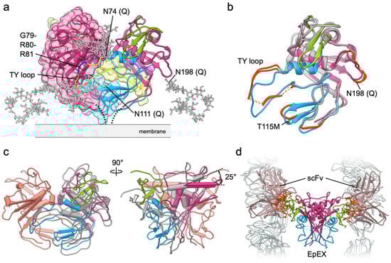 Additional insight into dimer architecture and dimerization-mediating interactions is provided by the second crystal structure of human EpEX in complex with a modified single-chain Fv fragment (scFv) from an anti-EpCAM Moc31 mAb (PDB 6I07) [34]. Similarly to the first structure, triple N-to-Q glycosylation-abolishing mutant protein was used, and the protein crystallized as a cis-dimer with two scFv fragments bound to each of the NDs, all within the same asymmetric unit, implying that the EpEX subunits are not related by a crystallographic axis and therefore not necessarily identical in structure. Few residues, mostly within the TY loop, were not resolved in the electron density map, however the overall subunit structure is similar with a RMSD over Cα atoms of 1.02 (Figure 3b) [34]. Some differences in the subunit structure are at the membrane distal part of the molecule where the EpEX-only structure accommodates a crystallization additive within a hydrophobic pocket causing a local conformational change, at a side-loop with the N198 glycosylation site (missing residues, or high B-factor indicating flexibility), in the TY loop, and near the CWCV motif of the TY domain. Here, in the EpEX-only structure the site 115 is occupied by a threonine residue while for the EpEX-scFv complex the methionine protein variant was used, resulting in a local structural change within this and the neighboring third loop of the TY without other far-reaching effects, since this region is not involved in extensive contacts with the rest of the subunit nor with the juxtaposed subunit. The T115M polymorphism has been linked to increased risk of breast cancer; however, the molecular mechanism is not known [35].