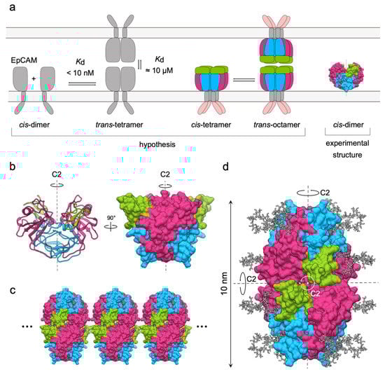 In agreement with the dimer/tetramer model of adhesion, a D2-symmetric model of an EpCAM trans-tetramer was proposed [11] (Figure 4d). This model accounted for all up-to-date experimental knowledge on EpCAM adhesion and theoretical knowledge on oligomer evolution: