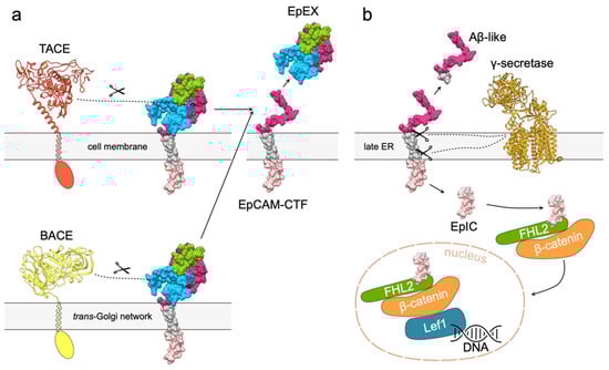 EpCAM signaling via RIP. (a) Cleavage of EpCAM extracellular part by either TACE or BACE results in release of soluble EpEX and membrane bound EpCAM-CTF. Extracellular part of TACE was modeled using Robetta [53,54], and structure extracellular part of BACE was obtained from the Protein Data Bank (PDB 2WJO). Transmembrane and cytosolic regions of both proteases are depicted schematically. EpCAM is presented as molecular surface; transmembrane region and intracellular domain are shown in gray and light pink, respectively. (b) Cleavage of EpCAM-CTF by γ -secretase complex (PDB 5A63) results in release of Aβ-like peptide and EpIC that is recruited in the EpIC–FHL2–β-catenin–Lef1 signaling complex. FHL (green), β-catenin (orange) and Lef1 (blue) are depicted by shapes corresponding to their relative sizes.