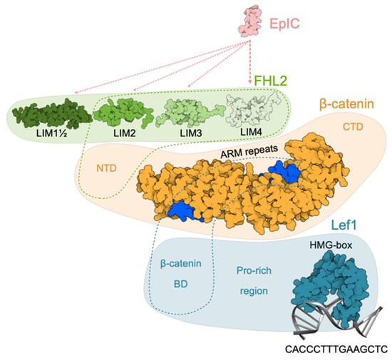 Structural information on the EpIC–FHL2–β-catenin–Lef1 signaling complex is sparse. The interacting pairs of proteins have been identified, but there is a lack of high-resolution structural data. However, some conclusions can also be drawn from structural investigations of β-catenin/Wnt-signaling pathway. First, EpIC interacts with FHL2 but not directly with β-catenin [59,60]. For interaction fourth LIM domain of FHL2 is crucial but the involvement of other LIM domains is not excluded [7]. Second, at minimum the last three LIM domains of FHL2 are needed for its interaction with β-catenin [61], but presence of the first and the half LIM domain increases the strength of the interaction. On the other hand, only N-terminal domain of β-catenin is needed for establishing a stable interaction [61]. The interaction between the full-length proteins is moderately strong (Kd ≈ 1.08 μM) [60]. Finally, crystal structure of β-catenin ARM repeats 2–10 with a bound part of Lef1 β-catenin-binding domain (β-catenin-BD) revealed that Lef1 interacts with β-catenin in an analogous manner as other members of TCF family. The affinities (dissociation constant) of β-catenin for Lef1 β-catenin-BD and its phosphorylated variant are 23 and 35 nM, respectively [62]. The structure of Lef1 HMG-box (291–391) bound to its target DNA segment was determined with NMR [63]. Considering all this structural data we build a schematic model of the complex (Figure 7).