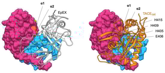 Comparison of EpEX cis-dimer structure (left) and model of EpEX–TACEcat complex (right). One subunit of the dimer (gray ribbon) covers the cleavage site within the other subunit (molecular surface, cleavage site in orange). This cleavage site is in EpEX monomer easily accessible as shown by the complex of one subunit with a catalytic domain of TACE (TACEcat; orange ribbon). The model was generated using HADDOCK [67] with α1 and α2 cleavage sites on EpEX (orange surface) or TACE active and zinc binding site (H405, E406, H409, and H415; gray side chains) used as interaction restraints.