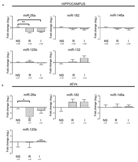 3.2. Changes in miR-26a Levels under In Vitro Stress-Like Conditions and in Animal Models of Stress