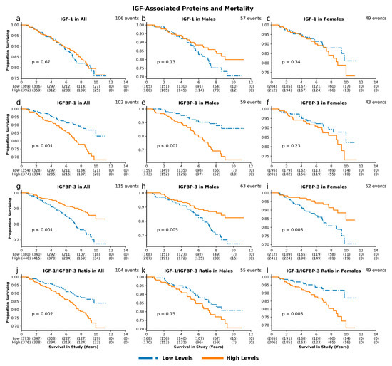 Statistical analysis was performed using custom scripts in Python (version 3.6), a general-purpose programming language. For all analyses tracking a particular biochemical measurement—IGF-1, IGFBP-1, IGFBP-3, or IGF-1/IGFBP-3 molar ratio—the participants were dichotomized into high and low groups using sex-specific medians of their baseline measurements. The median IGF-1 for men was 123 ng/mL and for women it was 105.5 ng/mL. Thus, the “low IGF-1” group was formed by combining men and women with IGF-1 levels below the sex-specific medians and the “high IGF-1” group was formed by combining men and women with IGF-1 levels at or above the sex-specific medians. “High” and “low” groups for analyses of IGFBP-1 (median 14 ng/mL in males, 18 ng/mL in females), IGFBP-3 (median 3.5 mg/L in males, 4.1 mg/L in females), and IGF-1/IGFBP-3 ratio (median 0.15 in males, 0.11 in females) were all formed by this procedure.