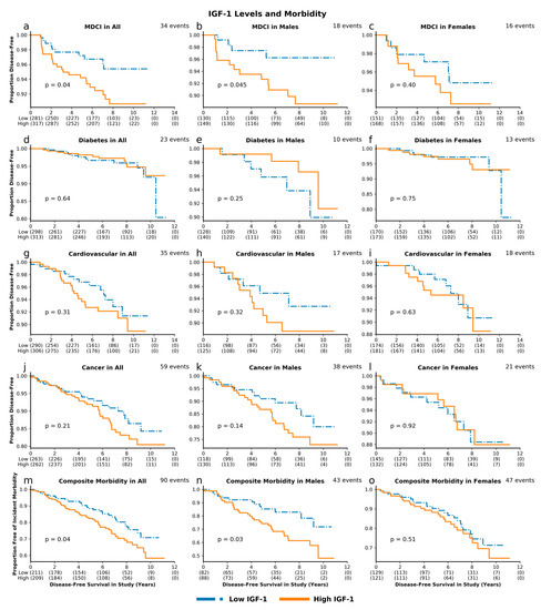 IGF-1 levels and morbidity. Unadjusted survival curves for multiple-domain cognitive impairment (MDCI) (a. combined cohort; b. males; c. females), diabetes (d–f), cardiovascular disease (g–i), cancer (j–l), and composite incident morbidity (m–o) in individuals with high and low levels of IGF-1.