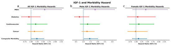 IGF-1 and morbidity hazard. Sex and age-adjusted morbidity hazards for all individuals in cohort (a), and age-adjusted morbidity hazards for males (b) and females (c) with high levels of IGF-1 as compared to individuals with low levels.