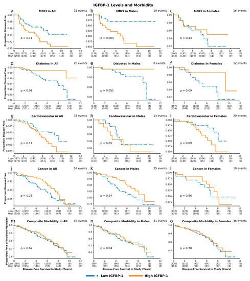 IGFBP-1 levels and morbidity. Unadjusted survival curves for MDCI (a. combined cohort; b. males; c. females), diabetes (d–f), cardiovascular disease (g–i), cancer (j–l), and composite incident morbidity (m–o) in individuals with high and low levels of IGFBP-1.